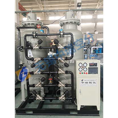 工藝原理:變壓吸附制氧裝置以潔凈的壓縮空氣為原料,沸石分子篩為吸附劑,利用變壓吸附的原理在常溫下來獲取氧氣。根據空氣中氧、氮在沸石分子篩表面的吸附量的差異及氧和氮在沸石分子篩中的擴散速率不同,通過可編程序控制器控制氣動閥的啟閉,實現加壓吸附、減壓脫附的過程,完成氧、氮分離,得到所需純度的氧氣。